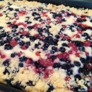 Pour half of the batter into a baking dish (20–25 cm in diameter), evenly spread the cottage cheese filling on top, then add the berries and gently press them into the cheese mixture. Sprinkle with the remaining half of the batter.
