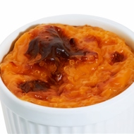 Spoon into greased molds and steam until cooked. Prepare a cherry sauce with cherries, water (100 ml), sugar (10 g), and potato starch. Pour over the soufflé.