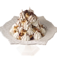 Continue layering, arranging the meringue in concentric circles that narrow towards the top. Fill the gaps between the meringue with cream and cherries.