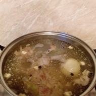 When the contents of the pot boil, skim off the foam, reduce the heat to the minimum so it just simmers, and continue cooking covered for 8 hours. An hour before it's done, add salt, bay leaf, pepper, and onion. Turn off the heat and let it cool.