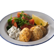 Serve the crab cakes hot, with a green salad, tartar sauce, and a wedge of lemon.