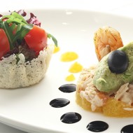 Combine the crab meat with the sautéed shrimp, adding salt and ground pepper, and dress with yogurt sauce.