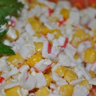 Finely chop the eggs, crab sticks, and onion, then add the corn and rice.