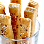 Sprinkle each strip with salt, sesame seeds, and caraway seeds. Bake at 347°F for 15 minutes until the sticks are golden brown.