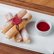 A nostalgic recipe — who doesn't remember those little nut-shaped cookies (or wafers) filled with sweetened condensed milk that mom used to make for birthdays? We have grown up, but we still miss this simple dessert. Like Proust's madeleines, it takes us straight back to childhood. Alex Johnson has slightly adapted the recipe, preserving that same taste. He mixed the sweetened condensed milk with a cloud of cream, making the filling softer and enhancing the contrast with the crispy wafers. Additionally, he included a strawberry sauce to serve with the wafers. Sweetened condensed milk, strawberries, crispy wafer shells — an absolutely winning combination. The recipe was shared by Alex Johnson, chef at a popular American restaurant.