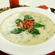 Return the soup to the pot and add the cream. Season with salt and pepper, gently heat, and serve in bowls, garnished with the crispy bacon.
