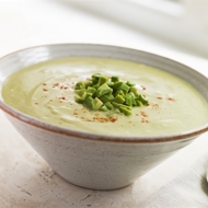 Cut the avocados in half, remove the pit, and place the flesh in a food processor. Add the broth, green onion, garlic, chili, cilantro, yogurt, coconut milk, olive oil, sugar, and 1 tablespoon of lemon juice. Blend until smooth.