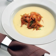 Serve by placing the sautéed shrimp in the center of the soup bowl.