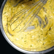 Whisk together three egg yolks and two tablespoons of water until emulsified. Stir in half of the reduced onion. Using a double boiler — you can simply hold the bowl over a pot of boiling water — whisk the sauce for about five minutes, until it reaches a consistency similar to shaving foam. It’s important not to overheat it — to avoid ending up with an omelet, so you can periodically remove the bowl from the steam.