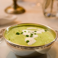 Add the broth, bring to a boil, reduce the heat, and add the peas. Cook for 10 minutes until soft. Remove from heat, add finely chopped mint, and blend until smooth. Season with salt and pepper and strain through a sieve to achieve a light consistency. Serve hot or cold, adding a spoonful of crème fraîche to each bowl and sprinkling with freshly ground pepper.