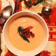 Stir the finished soup well, remove it from the heat, and let it sit covered for a while. When serving, you can garnish it with a strip of crispy bacon and some herbs.