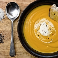 Pour the soup into 4 small bowls and drizzle some cream on top in a spiral pattern. Serve with warm bread.