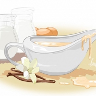 In one bowl, combine the starch, sugar, and egg yolks. In another, bring the milk and cream with vanilla to a boil (split the vanilla pod and add the seeds to the milk first, then the rest of the pod).