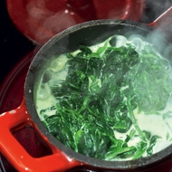 In a large pot, bring two to three liters of water to a boil with a teaspoon of salt. Add the prepared spinach leaves to the boiling water, stirring them in to ensure each leaf gets submerged, and cook for thirty seconds. No longer. This is important. Overcooked spinach is much like overcooked meat; the enjoyment diminishes significantly.