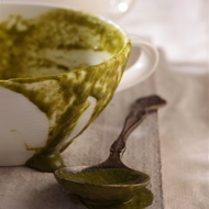 Once the greens are cooked down, use an immersion blender to puree the mixture of vegetables, mushrooms, and salads. Add the cream. Blend again.