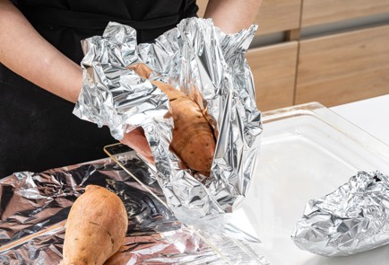 Wrap the sweet potato in foil and place it in the oven for one to one and a half hours at 356°F.