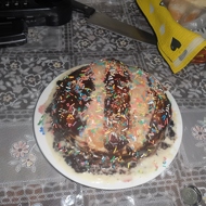 Once all the crepes are assembled this way, the edges can be coated with chocolate glaze. The top of the cake can be sprinkled with colorful confectionery sprinkles.