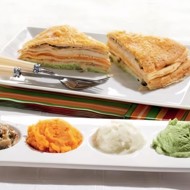 Then, layering each filling with 2 crepes, alternately add: half of the mushroom mixture, carrot puree, cauliflower puree, and the remaining mushroom mixture.