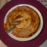 Layer the crepes in the pan and brush them with the grape juice sauce. Cover the entire cake with the sauce or, if a small crepe was made from leftover batter, place it on top of the fully sauced crepe and only brush it with sunflower oil.