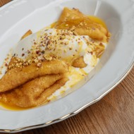 Cook thin pancakes in a hot skillet. Fold them into triangles.