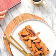 For the sauce, add a piece of ghee to a preheated skillet, melt it, and start sautéing the fruits. First, add the apples and cook for 2 minutes, then add the plums and sauté together for another 2 minutes.