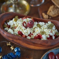 In a salad bowl, combine the tomatoes, croutons, feta, capers, olives, and drizzle with olive oil and wine.