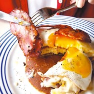 Top the pancakes (2 pieces per serving) with the sunny-side-up egg, bacon, and most importantly — a piece of bourbon butter and maple syrup!