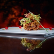 Dress the salad mix, place the duck using a round mold, and top with the salad mix.