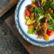 Combine the warm quinoa and eggplant, then add the diced tomatoes and mixed salad greens.