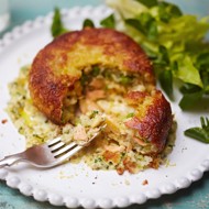 Divide the cooled mixture into four parts, shape into cakes, coat in flour, dip in lightly beaten egg, and coat in breadcrumbs.