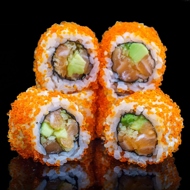 Place a sheet of nori on a sushi mat, then spread rice on top. In the center of the rice, add a mixture of salmon and avocado. Roll it up using the mat to form a log shape. Remove the mat and coat the roll in tobiko and sesame seeds. Cut the roll into 6 equal pieces, trimming any uneven edges first. Arrange on a plate with wasabi and ginger.