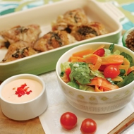 Chop half a pack of romaine lettuce. Peel 2–3 carrots and slice them into thin rounds. Cut 1 pack of cherry tomatoes in half. Dice half of the red paprika. Toss the salad in a bowl and season with 1.5 tablespoons of olive oil, 1.5 teaspoons of white wine vinegar, 2 pinches of salt, and a pinch of black pepper.
