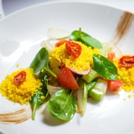 Steam the couscous with boiling water and season with turmeric and olive oil.