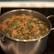 In a pot, heat olive oil (enough to cover the bottom by a couple of millimeters), lightly sauté the onion with garlic, then add parsley and cook for 2-3 minutes, stirring. Next, add the tomatoes and cook for a couple of minutes over high heat, then add half a cup of water or vegetable broth, reduce the heat, cover with a lid, and let it simmer for about 15-20 minutes.