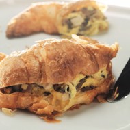 Warm the croissants in the microwave, oven, or in a dry skillet, cut off the tops, and fill them with omelet.