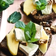 Place the cheese on the warm pieces of bread, add slices of mango, and drizzle with olive oil or walnut oil (if desired). Garnish with mint and walnuts.