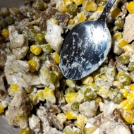 Add the fried chicken and mayonnaise. Mix thoroughly, cool, and serve.