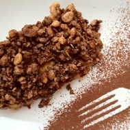In another bowl, combine the muesli, flour, brown sugar, and warm butter. Mix by hand to form a crumbly dough. Make sure the butter evenly coats all the dry ingredients, in other words, it should be melted. Sift unsweetened cocoa powder into the dough and mix everything well again. The crumble should have a rich dark color.