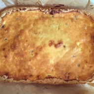 Place in an oven preheated to 356°F until the cottage cheese layer is set and the surface is a bright golden color (25–35 minutes). If the surface browns quickly while the cottage cheese is still liquid, cover the dish with foil and reduce the temperature by 20 degrees. Remove the finished pie from the dish after it has completely cooled.