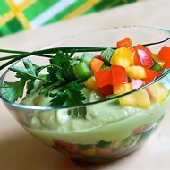 Place some of the chopped vegetables in bowls, pour the chilled soup over them. Garnish with herbs and the remaining chopped vegetables.