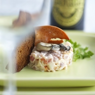 Layer the ingredients. Start with the salad, then add cucumbers, crab sticks, mayonnaise, shrimp, and top it off with cheese.