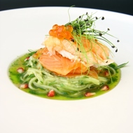 Cucumber Spaghetti with Smoked Trout, Kamchatka Crab, and Olive Oil, Vinegar, and Maple Syrup Sauce