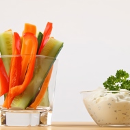 Slice fresh vegetables and arrange them on a plate. Place a serving bowl with the dip next to it and serve.