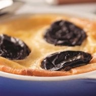 Place the soaked bread in a terrine, then layer the prunes and raisins on top. Pour the flan mixture over it and cook in a water bath for 30 minutes.