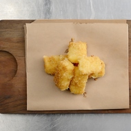 Pour sunflower oil into a deep frying pan (or a deep fryer) and heat it thoroughly. Carefully place the slices of cheese in the pan. Fry for 20–30 seconds on each side until golden brown.