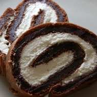 Flip the sponge cake onto the paper, removing any stuck paper. Start spreading the cream — place more filling closer to you. Roll the cake tightly. Wrap the roll in paper and refrigerate seam side down for a day.