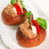 Spread the sprat pâté inside the dakos. Garnish with lettuce leaves, a slice of feta, and a tomato slice. Season with Herbes de Provence to taste.