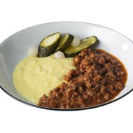 A traditional dish from Danish cuisine, which can be loosely translated as 'a million steaks.' Here, beef is used in the form of ground meat (hence the million pieces), which is simmered in beef broth along with sautéed onions. It is best served with mashed potatoes or pasta. We chose the first option to avoid associations with military-style pasta.