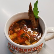 Transfer the soup to a bowl, add the zucchini, and serve.