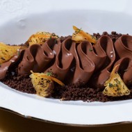 Using a piping bag, place the ganache on a plate, sprinkle the chocolate crumble next to it. Arrange the charred segments, drizzle with spicy oil, and sprinkle with Maldon salt.